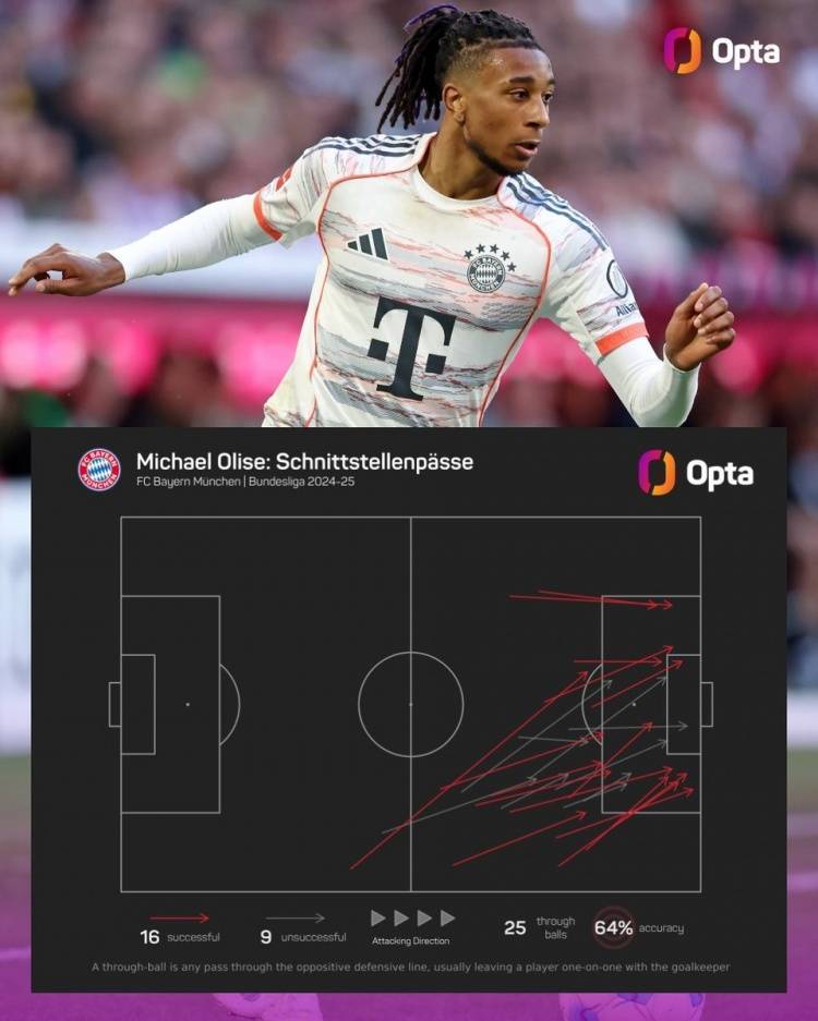 数据统计显示,奥利塞上赛季联赛共计25次尝试直塞,成功率64%。